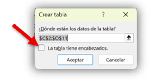 habilita la casilla “La tabla tiene encabezados”, para mantener el título de la