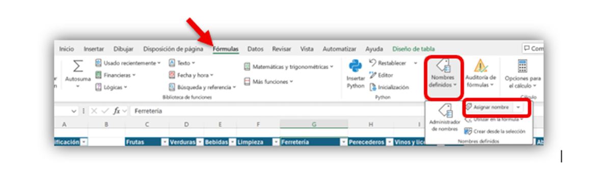 en el menú la opción Fórmulas, después da click en Nombre definidos y por