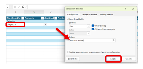 donde deberás escribir en Origen el signo igual (=), la palabra INDIRECTO, abre